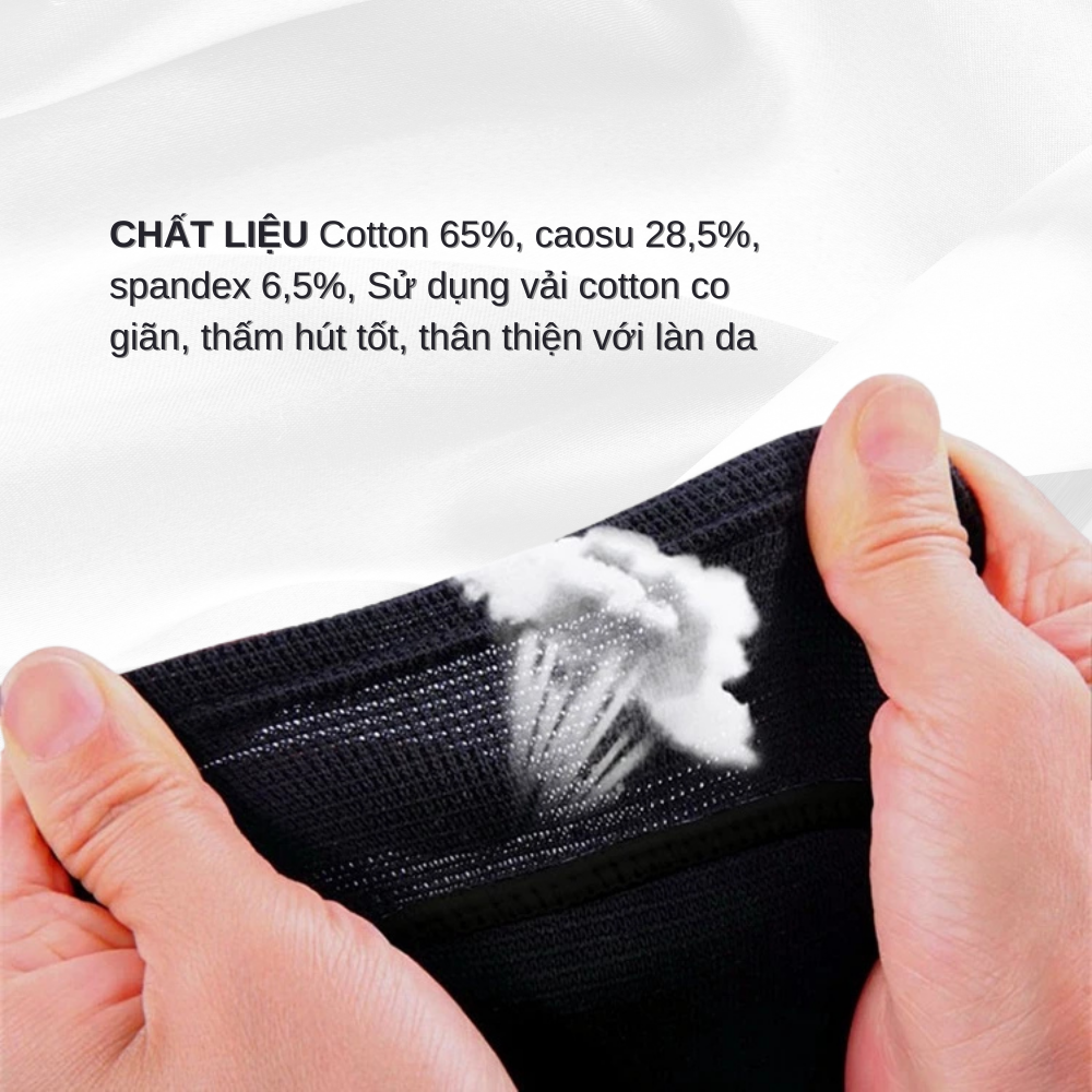 - Chất liệu: Cotton 65%, caosu 28,5%, spandex 6,5%, Sử dụng vải cotton co giãn, thấm hút tốt